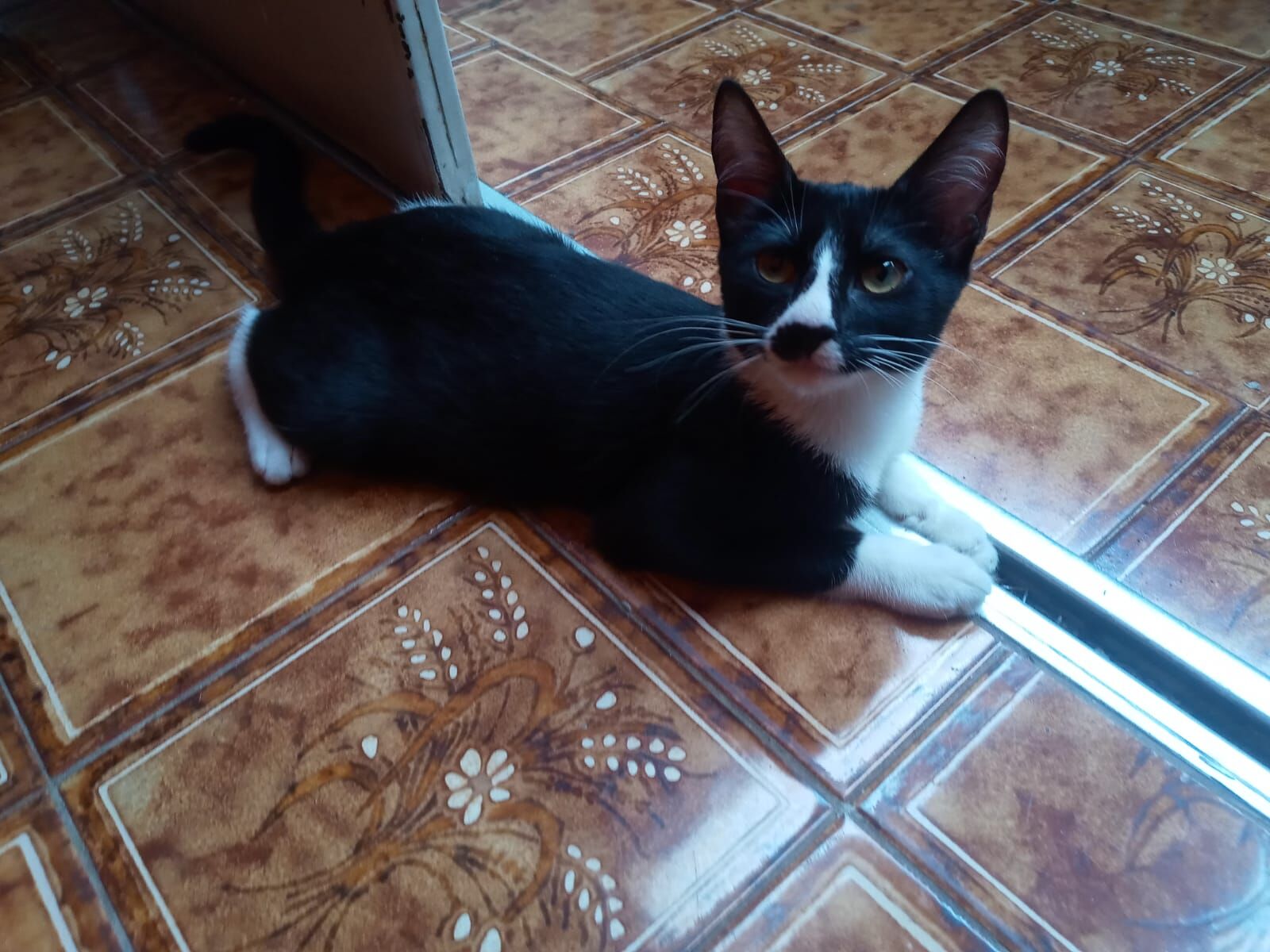 Gata pequena, 2 a 6 meses, SRD-ViraLata, cor Branca/Preta.